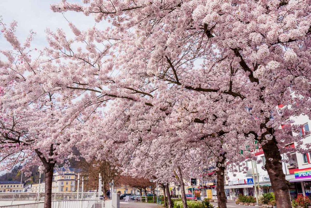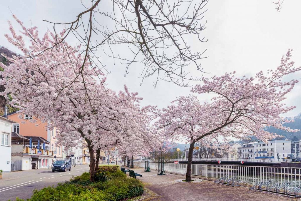 Hier sind einige visuelle Impressionen von Bad Ems, den üppigen Kirschblüten und dem imposanten Schloss Stolzenfels.